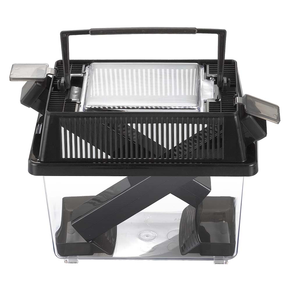 Контейнер со специальными пластиковыми трубками с засечками внутри. Черные трубки привлекают насекомых, так как они любят темные, укромные места. Засечки внутри трубки позволяют насекомым без труда забираться внутрь. При кормлении рептилии достаточно просто вытащить трубку, в которой уже будут насекомые, и вытряхнуть их в террариум.