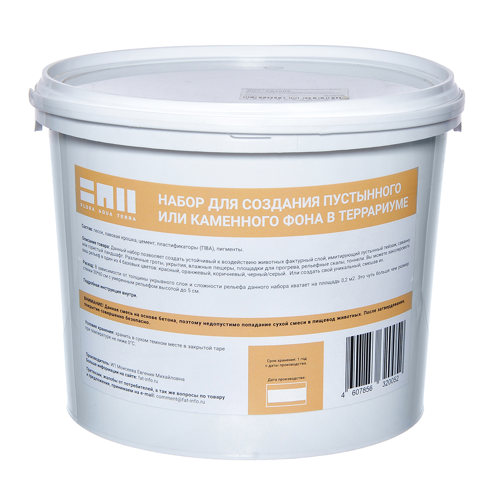 Данный набор позволяет создать устойчивый к воздействию животных фактурный слой, имитирующий пустынный пейзаж, саванну или гористый ландшафт. Различные гроты, укрытия, влажные пещеры, площадки для прогрева, рельефные скалы, тоннели. Вы можете заколеровать ваш рельеф в один из 4 базовых цветов: красный, коричневый, оранжевый или черный/серый. Или создать свой уникальный, смешав их. В зависимости от толщины укрывного слоя и сложности рельефа данного набора хватает на площадь 0,2 м2. Это чуть больше чем размер стенки 30*60 см с умеренным рельефом высотой до 5 см. Подробная инструкция по использованию входит в комплект с набором. ВНИМАНИЕ! Данная смесь на основе бетона, поэтому недопустимо попадание сухой смеси в пищевод животных. После затвердевания, покрытие совершенно безопасно. Состав смеси: песок, лавовый лавовая крошка, цемент, пластификаторы (ПВА), пигменты. Состав набора: Пластиковый контейнер 2 л с крышкой, пластиковый контейнер 750 мл 2 флакона по 200 мл с пластификатором Мини-триггер для флаконов 2 пакета с базовой смесью по 700 мл 1 пакет с финишной смесью объем 500 мл Колер 1 "Красный", колер 2 "Коричневый", колер 3 "Оранжевый", колер 4 "Черный/серый" Шпатель для удобства нанесения смеси 40 мм Сетка 50*100 см ячейка 2х2 мм Проволока для закрепления сетки 10 шт. по 40 см Бумажная инструкция А4 Условия хранения: хранить в сухом темном месте в закрытой таре при температуре не ниже 0℃. Срок хранения: 1 год (срок агрохимической годности не ограничен).
